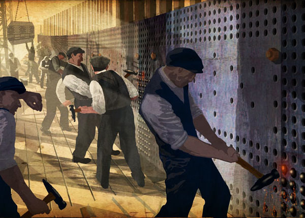 8 Years after the death of Isabella, the construction of the Titanic began to rise above the working-class scullery houses of Belfast docks. Margaret was 10 years old, and her father William worked the dockyard shifts of Harland and Wolff. He had the advantage of being a left-handed riveter. Which meant awkward crevices and steel joints on the Titanic were more accessible to him than a right-handed work colleague. Here is a description of the daily routine for riveters. The information is taken from the online Titanic archives, and we can use William as the main Character.